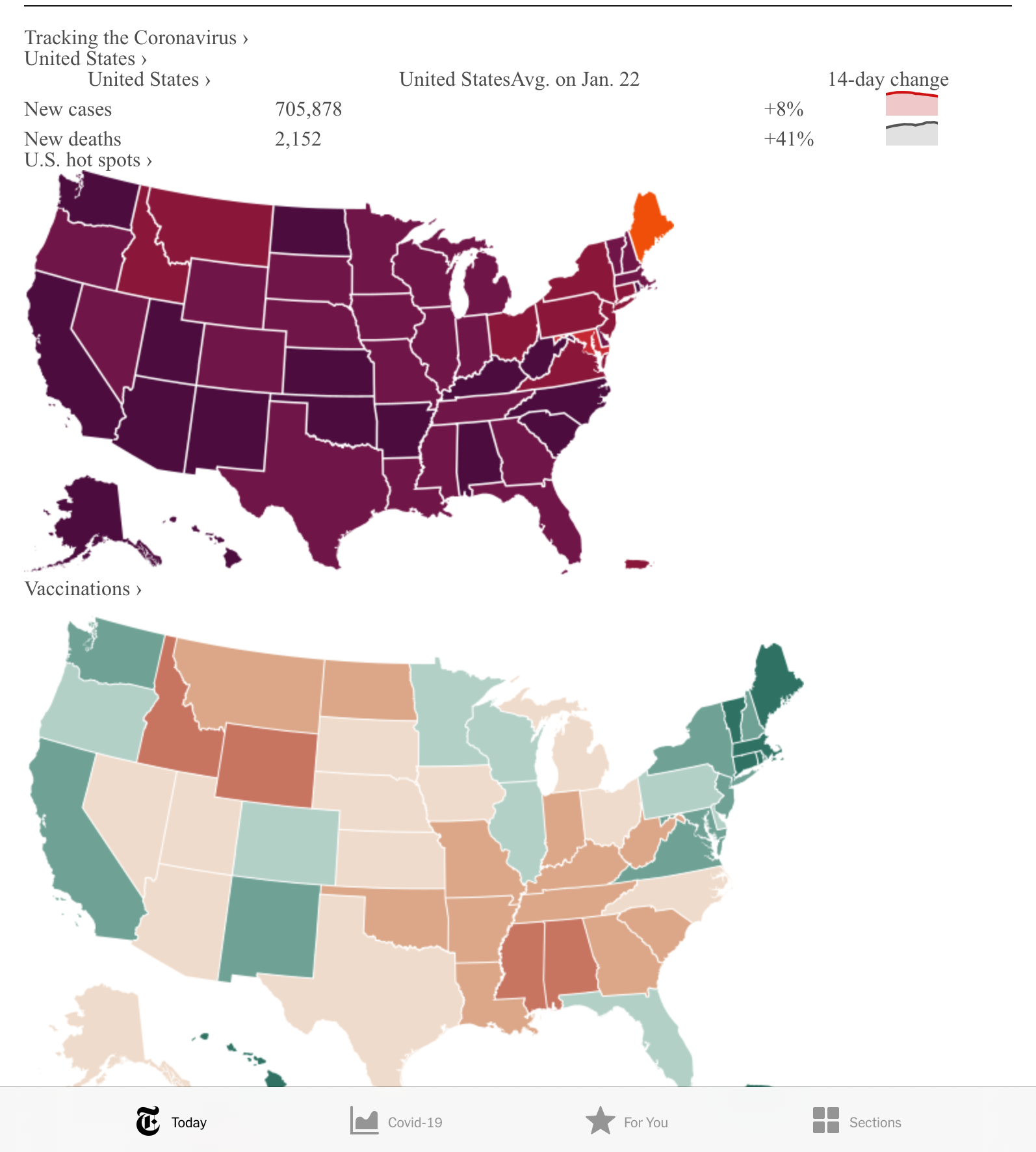 Maine, as I have written before, stands out. Every morning as I peruse the newspapers, I often start with checking the Covid-19 numbers in places where I have children, grandchildren, and where I spend time. Since the Omicron variant has dominated headlines, Maine has had among the very lowest infection numbers in the country. While they struggled for a time in rural parts of the state in early fall, since Omicron Maine has been consistently cited by the data, courtesy of the New York Times, as #1 with the fewest infections per 100,000.
